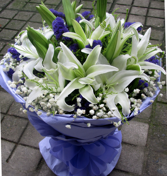 16朵香水百合,搭配勿忘我、满天星。