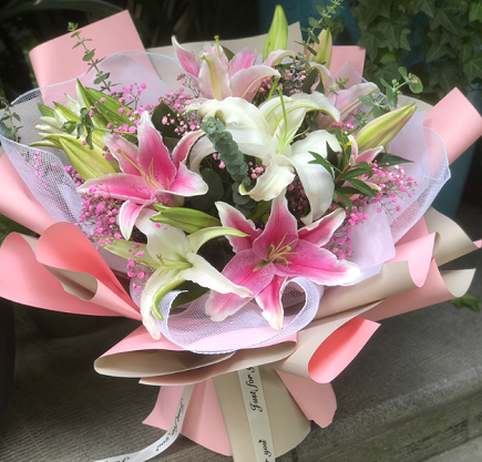 21朵粉色和白色百合混搭,满天星,尤加利叶搭配